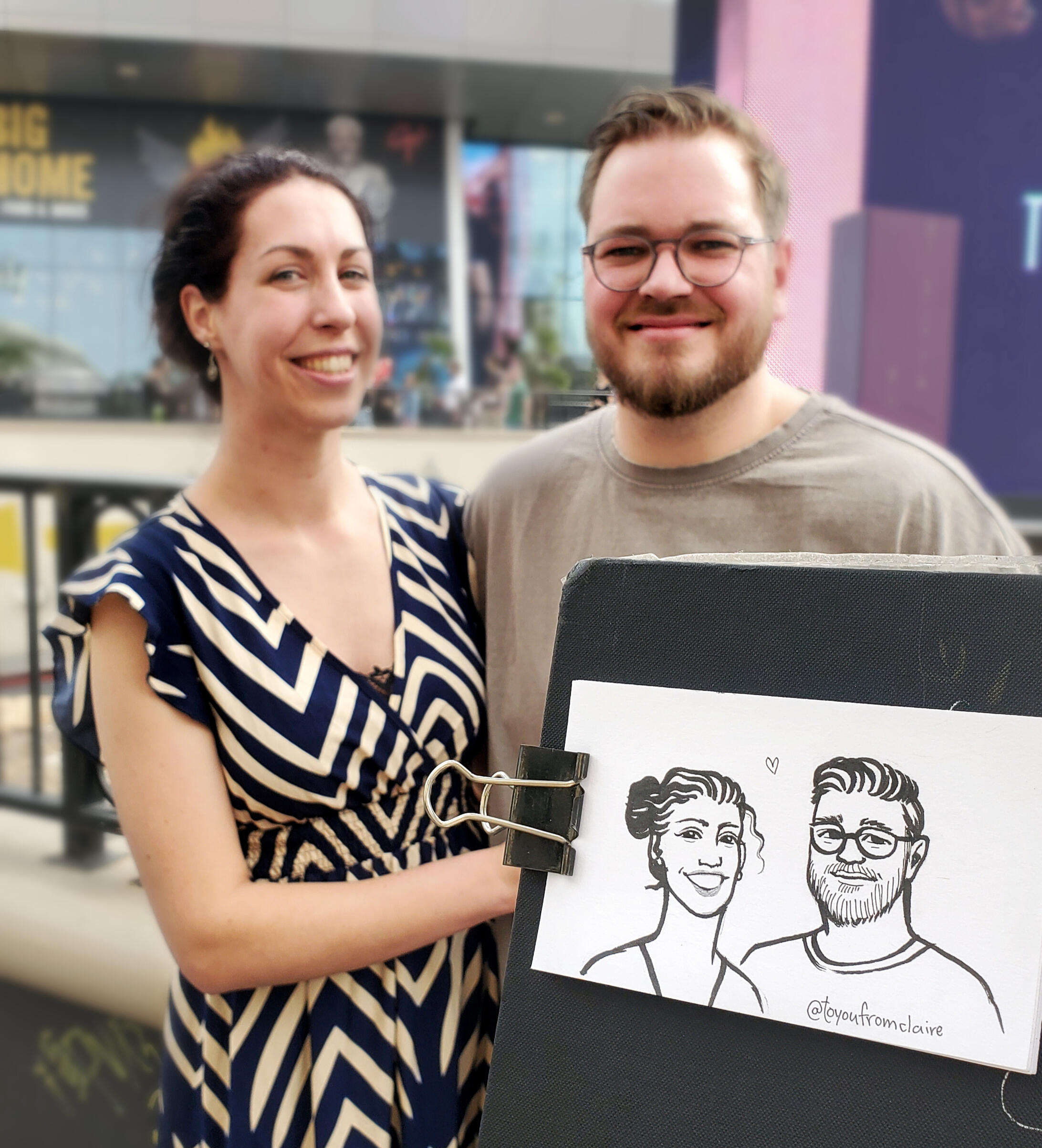 Over the last year, I've drawn roughly 3,000 people on the streets of Las Vegas. As an artist, I'm fast, accurate, and confident in any setting. Beyond being experienced with every kind of appearance, regardless of age, shape, or color, I'm passionate about connecting with everyone I draw. I can promise a friendly rapport and quality drawings that bring brightness to any occasion. Plus, I've never met anyone else that does exactly what I do!How do I get a quote?